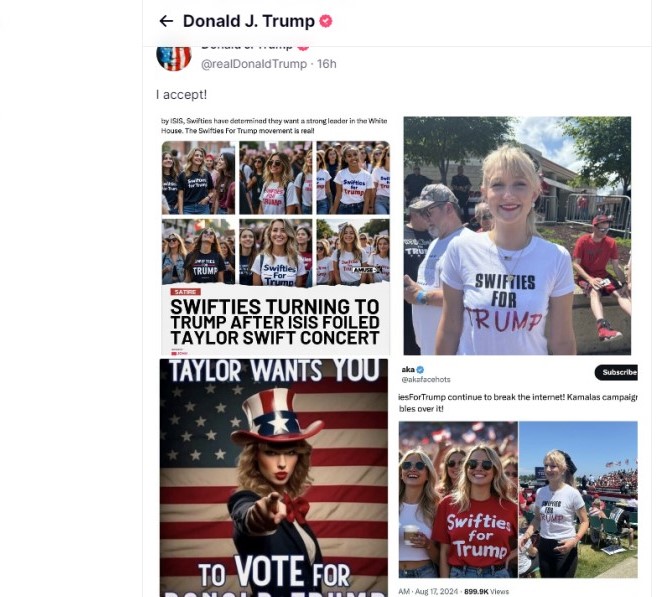 Кандидат в президенты США Дональд Трамп разместил на сайте Truth Social четыре фото, созданные с помощью искусственного интеллекта. При этом Трамп утверждает, что они иллюстрируют набирающее силу движение избирателей в его поддержку «Swifties for Trump».